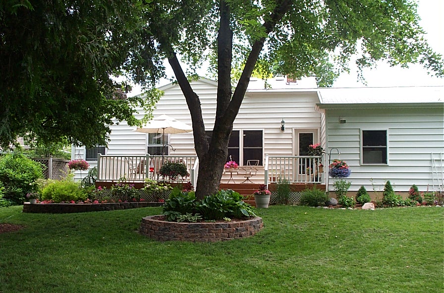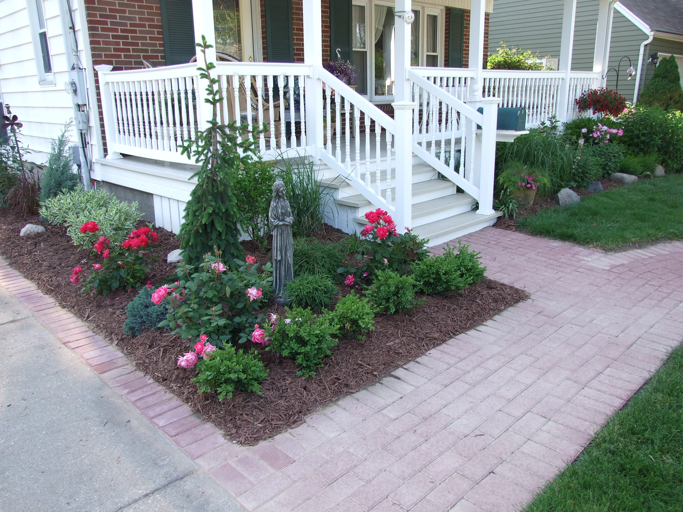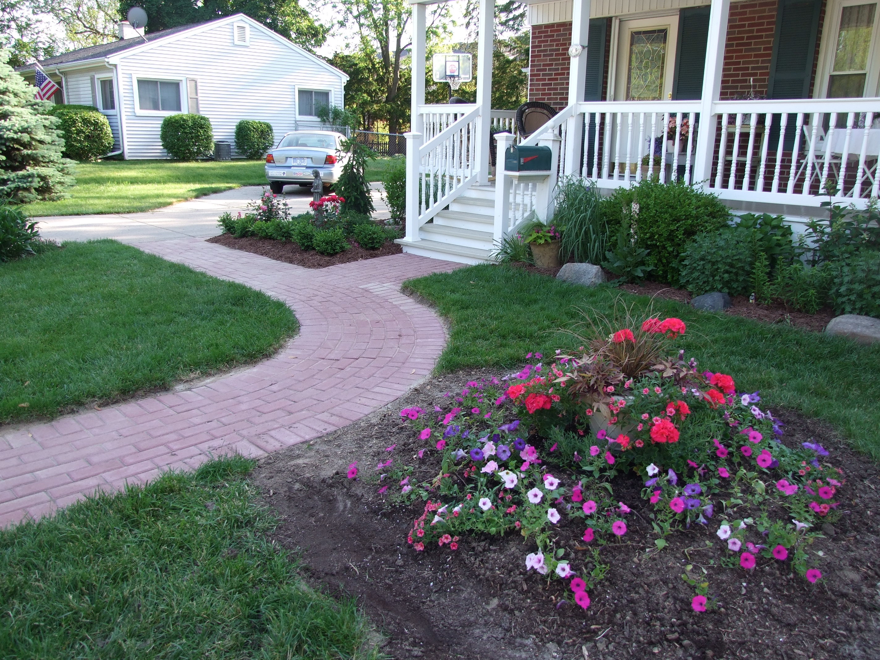The Kabodians are family friends and I’ve done significant work around their house. The backyard was done in the summer of 2005. The family had just done a major addition to the back of the house and needed landscaping designed and installed in time for their daughter’s high school graduation later that spring. The landscape plan that I created included short retaining walls and a large amount of plants to make the landscape look more grown in (deck installed by homeowners separately). The front landscape job was completed in the spring and summer of 2009. Since adding on the front porch as part of the addition, and subsequently adding new stairs in the Spring of 2009, the family had wanted a new walk to the stairs. As part of this plan I removed the original concrete walk that ran along the side of the house and toward the new stairs and I installed a new brick walk by hand. Following this, we installed new landscaping in the front and along the side of the house. (Please click link at bottom of project sheet)