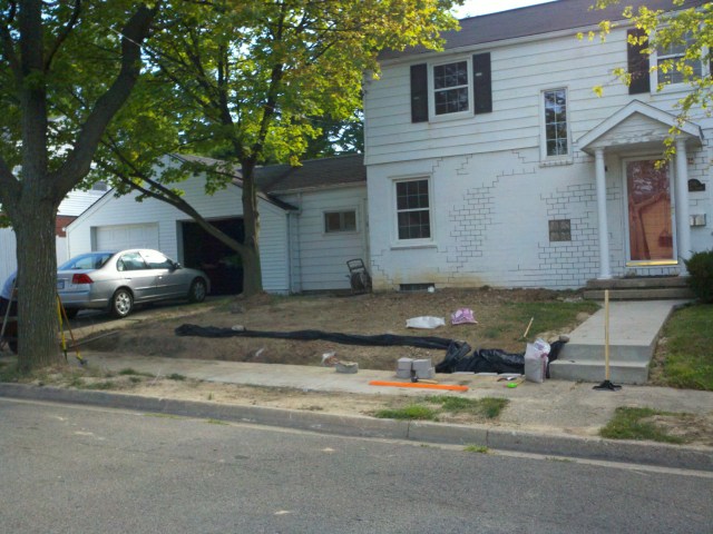Caleb Sandoval was the best man in my wedding. His 1950′s era house had a gently sloping front yard until it dipped steeply to sidewalk grade. Caleb had wanted to solve this problem for years. In the spring of 2010, the sewer main leaving his house collapsed and his yard was severely torn up during replacement. He used this opportunity to solve his grading issue. I helped him install a retaining wall between his driveway and front walk, with a maximum height of just over 2 feet in the summer of 2010. This past summer (2011) we installed a second wall starting at the walk and heading the other direction around the corner of his property with a maximum height of just under 4 feet.